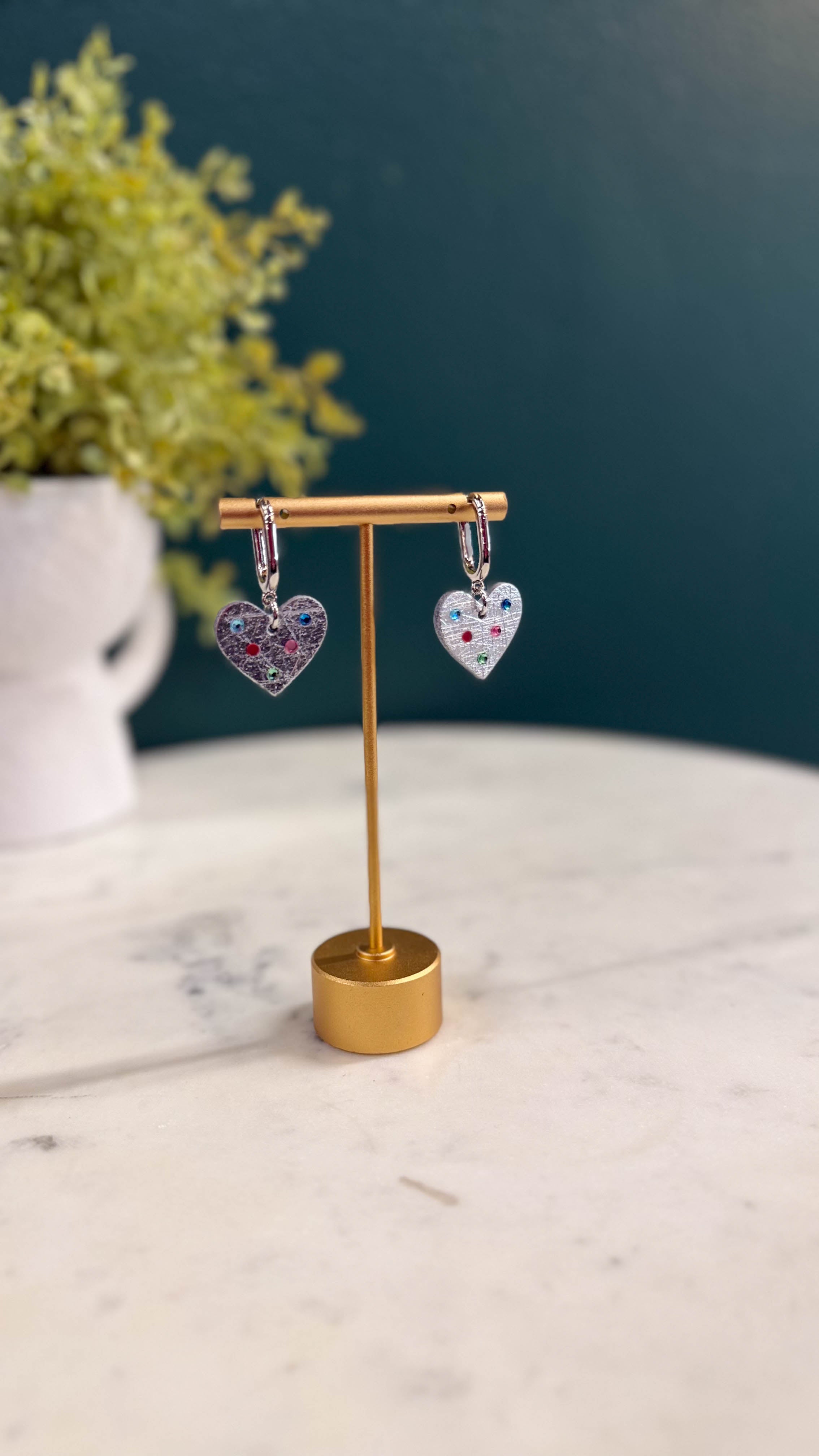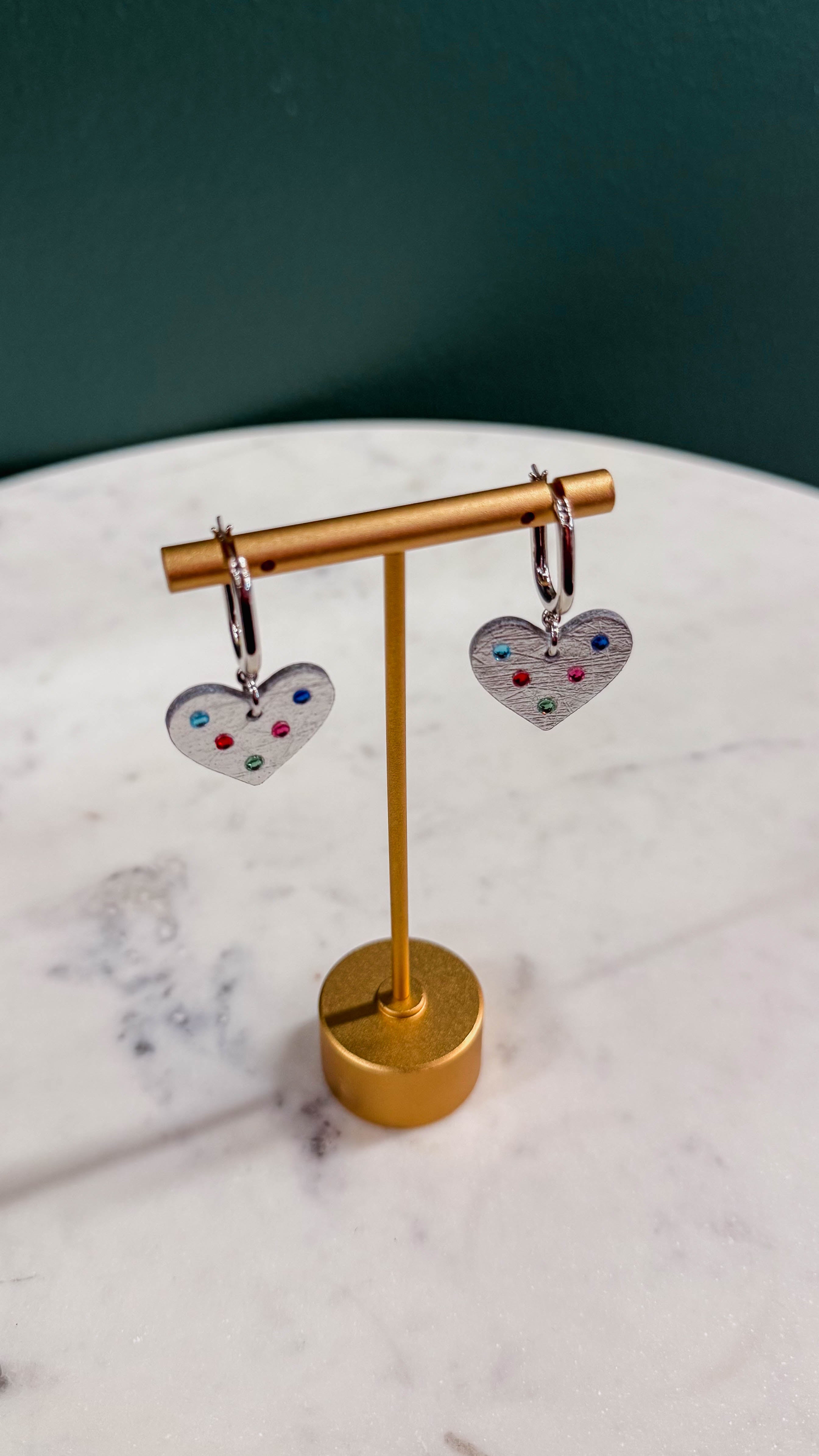 The Vintage Silver Jeweled Quinns create a bold statement, featuring a lightweight leather heart on a huggie earring with a multi-colored jeweled component.