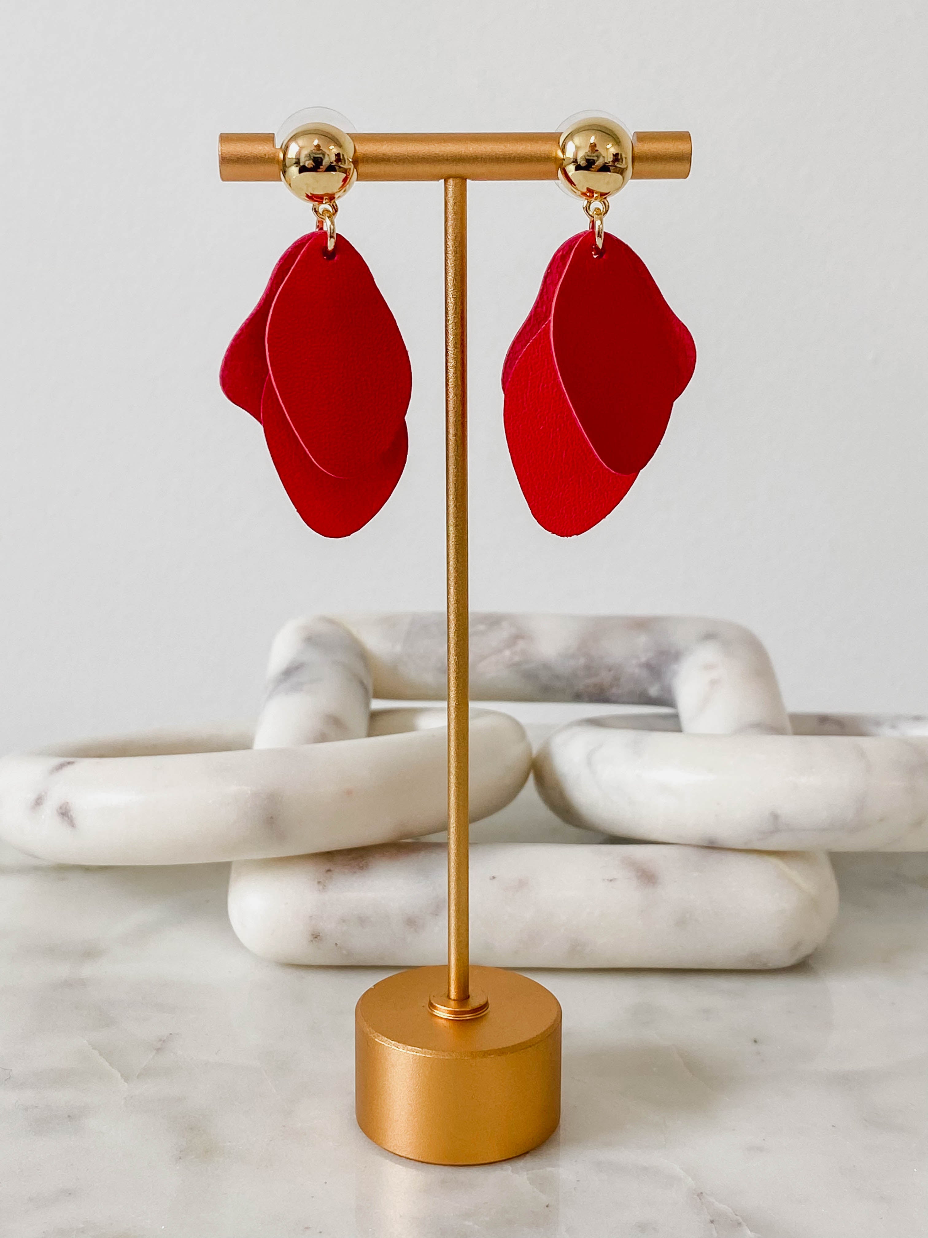 A new take on leather earrings, introducing the Weston. Crafted with soft Pomegranate Leather and a gold stud piece. These statement stud earrings are a one-of-a-kind, free-flowing leather earring, with subtle movement and lightweight design.