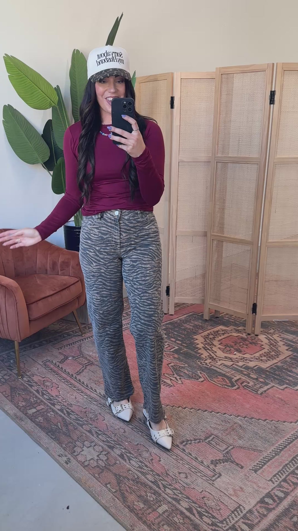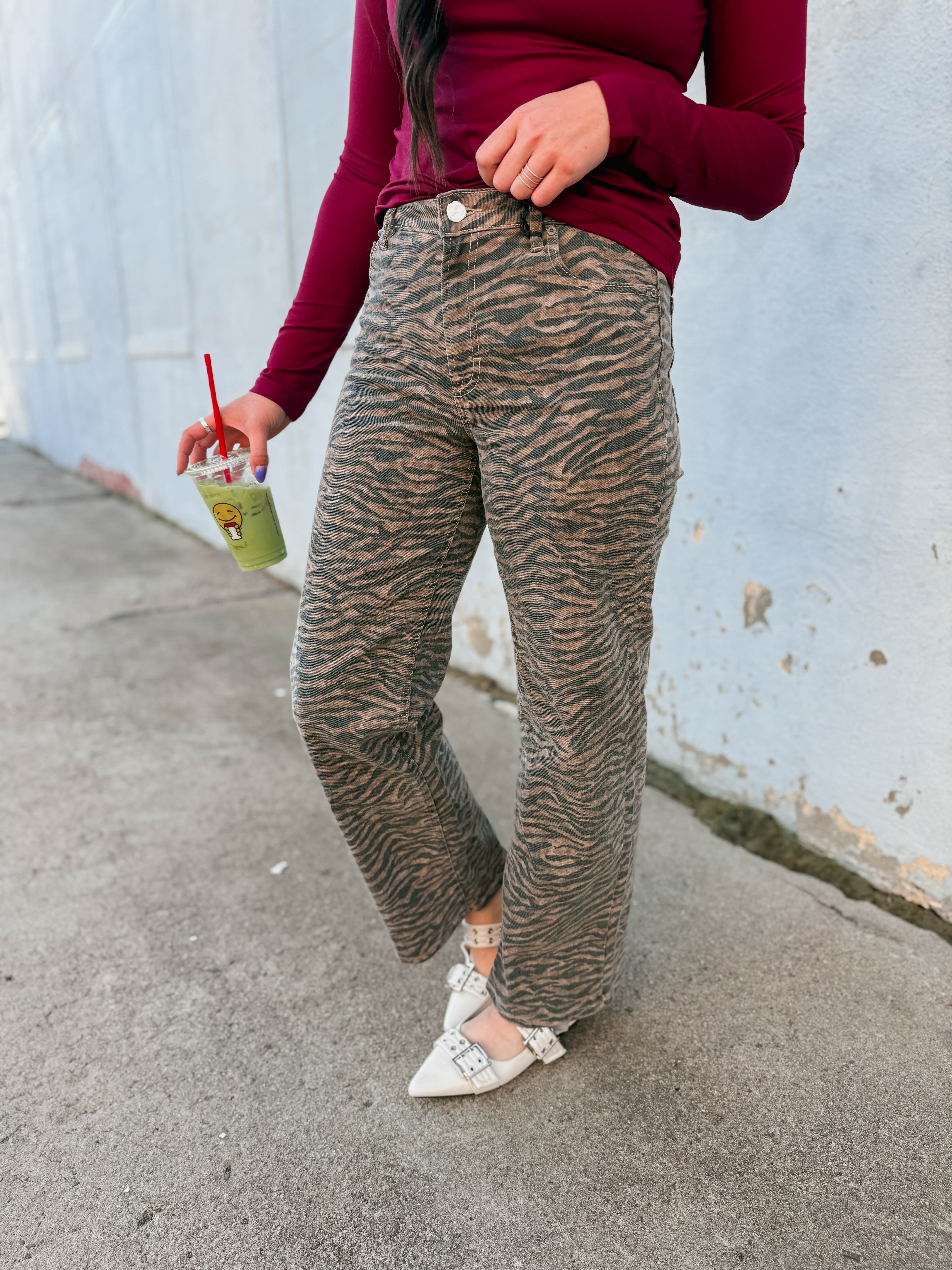 These Wild Streak High Rise Dad Jeans bring a fun, spunky vibe with their bold tiger print. Featuring a high-rise fit and classic zip fly with button closure, they’re perfect to dress up with a playful blouse or keep casual with your favorite graphic tee.